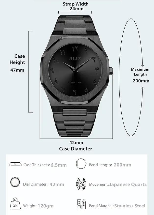 This Black Arabic Watch is a blend of cultural elegance and modern durability. With bold Arabic numerals and a sleek all-black stainless steel body, it’s a timeless piece that speaks sophistication and identity.